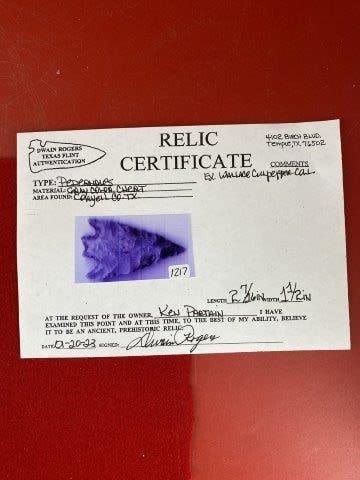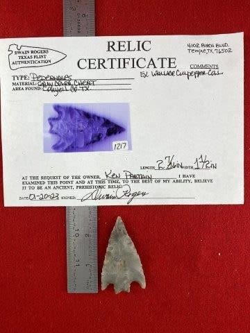 Please see picture for measurment. It is from Coryell County, Texas. Comes with Dwain Roger’s Certificate of Authenticity. Ex- Wallace Culpepper ; Ken Partain ; KEY WORDS: NATIVE AMERICAN INDIAN ARTIFACT ARTIFACTS ARROWHEAD ARROWHEADS MISSISSIPPIAN QUAPAW CADDO POTTERY COINS