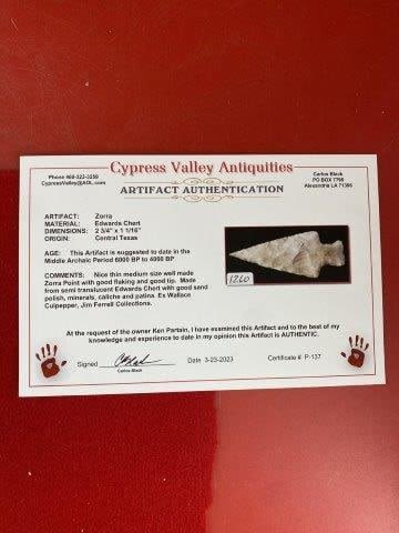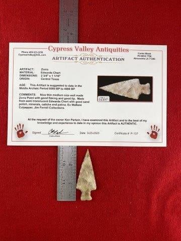 Please see picture for measurment. It is from Central Texas. Comes with Carlos Black Certificate of Authenticity. Ex- Wallace Culpepper ; Jim Ferrell ; Ken Partain ; KEY WORDS: NATIVE AMERICAN INDIAN ARTIFACT ARTIFACTS ARROWHEAD ARROWHEADS MISSISSIPPIAN QUAPAW CADDO POTTERY COINS
