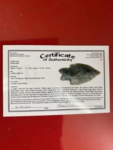 Please see picture for measurment. It is from Coryell County, Texas. Comes with Ken Partain Certificate of Authenticity. Ex- Wallace Culpepper ; Jim Ferrell ; KEY WORDS: NATIVE AMERICAN INDIAN ARTIFACT ARTIFACTS ARROWHEAD ARROWHEADS MISSISSIPPIAN QUAPAW CADDO POTTERY COINS