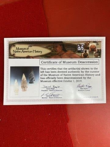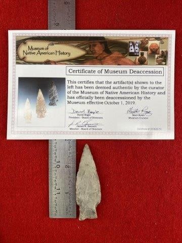Please see picture for measurment. It is from Texas. Comes with Museum of Native American History Certificate of Authenticity. Ex-Ken Partain ; KEY WORDS: NATIVE AMERICAN INDIAN ARTIFACT ARTIFACTS ARROWHEAD ARROWHEADS MISSISSIPPIAN QUAPAW CADDO POTTERY COINS