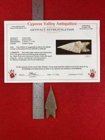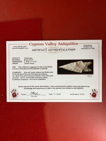Please see picture for measurment. It is from central Texas. Comes with Carlos Black Certificate of Authenticity. Ex- Wallace Culpepper ; Jim Ferrell ; Ken Partain ; KEY WORDS: NATIVE AMERICAN INDIAN ARTIFACT ARTIFACTS ARROWHEAD ARROWHEADS MISSISSIPPIAN QUAPAW CADDO POTTERY COINS