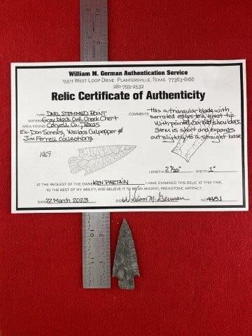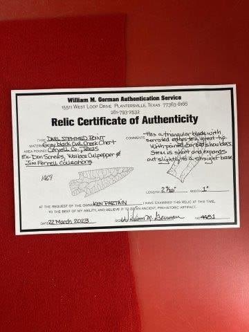 Please see picture for measurment. It is from Coryell County, Texas. Comes with William German Certificate of Authenticity. Ex-Don Screws ; Wallace Culpepper ; Jim Ferrell ; Ken Partain ; KEY WORDS: NATIVE AMERICAN INDIAN ARTIFACT ARTIFACTS ARROWHEAD ARROWHEADS MISSISSIPPIAN QUAPAW CADDO POTTERY COINS