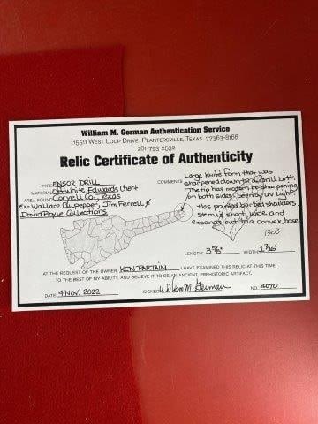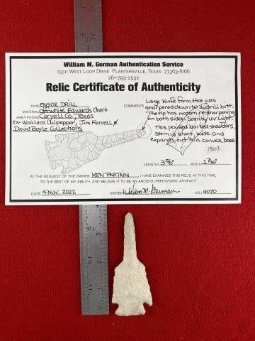 Please see picture for measurment. It is from Coryell County, Texas. Comes with William German Certificate of Authenticity. Ex- Wallace Culpepper ; Jim Ferrell ; David Bogle ; Ken Partain ; KEY WORDS: NATIVE AMERICAN INDIAN ARTIFACT ARTIFACTS ARROWHEAD ARROWHEADS MISSISSIPPIAN QUAPAW CADDO POTTERY COINS