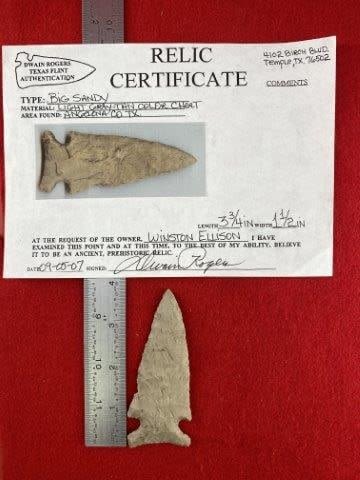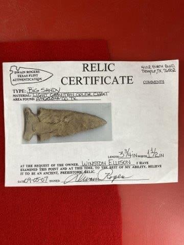 Please see picture for measurement. It is from Angelena County Texas. It comes with a Dwain Rogers Certificate of Authenticity. All artifacts came from the great state of Texas. Ex-Winston Ellison, Warren & Darla Suleske Collection, they are pictured in Who Who’s #12. They have collected wonderful arrowheads & artifacts for over 40 years! KEY WORDS: NATIVE AMERICAN INDIAN ARTIFACT ARTIFACTS ARROWHEAD ARROWHEADS MISSISSIPPIAN QUAPAW CADDO POTTERY COINS