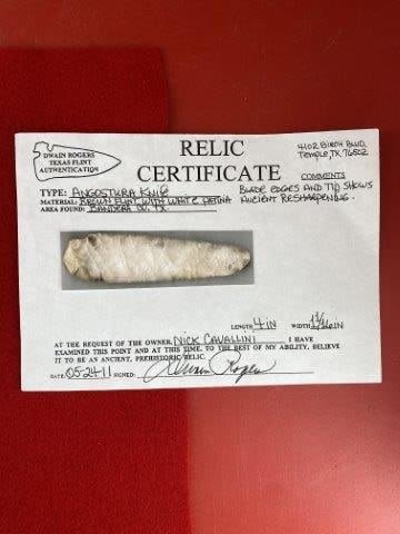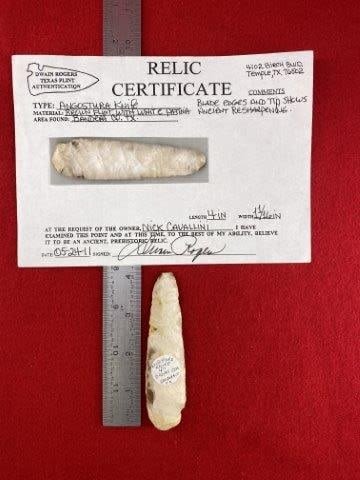 Please see picture for measurement. It is from Bandera County Texas. It comes with a Dwain Rogers Certificate of Authenticity. All artifacts came from the great state of Texas. Ex-Nick Cavallini, Warren & Darla Suleske Collection, they are pictured in Who Who’s #12. They have collected wonderful arrowheads & artifacts for over 40 years! KEY WORDS: NATIVE AMERICAN INDIAN ARTIFACT ARTIFACTS ARROWHEAD ARROWHEADS MISSISSIPPIAN QUAPAW CADDO POTTERY COINS
