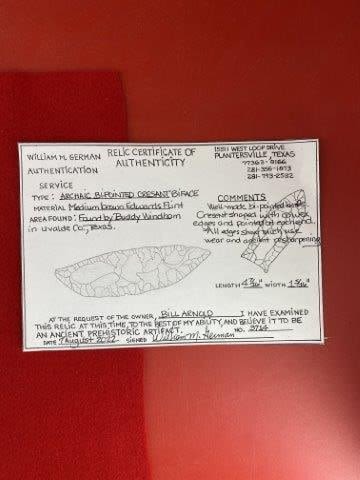 Please see picture for measurement. It is from Uvalde County Texas. It comes with a William German Certificate of Authenticity. All artifacts came from the great state of Texas. Ex-Bill Arnold, Warren & Darla Suleske Collection, they are pictured in Who Who’s #12. They have collected wonderful arrowheads & artifacts for over 40 years! KEY WORDS: NATIVE AMERICAN INDIAN ARTIFACT ARTIFACTS ARROWHEAD ARROWHEADS MISSISSIPPIAN QUAPAW CADDO POTTERY COINS