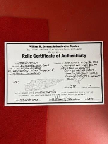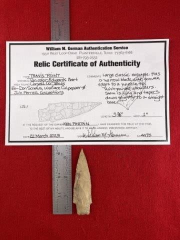 Please see picture for measurment. It is from Coryell County, Texas. Comes with William German Certificate of Authenticity. Ex- Don Screws ; Wallace Culpepper ; Jim Ferrell ; Ken Partain ; KEY WORDS: NATIVE AMERICAN INDIAN ARTIFACT ARTIFACTS ARROWHEAD ARROWHEADS MISSISSIPPIAN QUAPAW CADDO POTTERY COINS