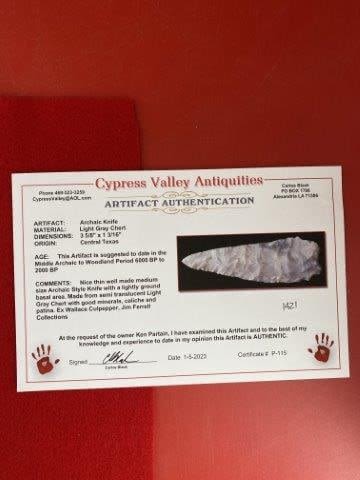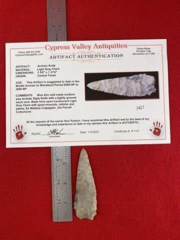 Please see picture for measurment. It is from Central Texas. Comes with Carlos Black Certificate of Authenticity. Ex- Wallace Culpepper ; Jim Ferrell ; Ken Partain ; KEY WORDS: NATIVE AMERICAN INDIAN ARTIFACT ARTIFACTS ARROWHEAD ARROWHEADS MISSISSIPPIAN QUAPAW CADDO POTTERY COINS
