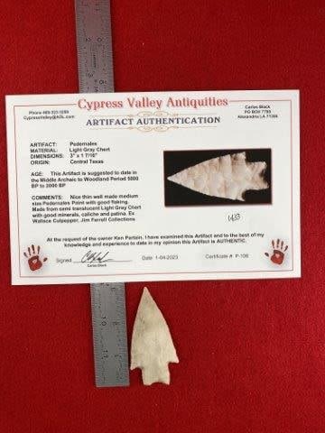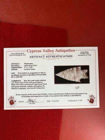 Please see picture for measurment. It is from Central Texas. Comes with Carlos Black Certificate of Authenticity. Ex- Wallace Culpepper ; Jim Ferrell ; Ken Partain ; KEY WORDS: NATIVE AMERICAN INDIAN ARTIFACT ARTIFACTS ARROWHEAD ARROWHEADS MISSISSIPPIAN QUAPAW CADDO POTTERY COINS