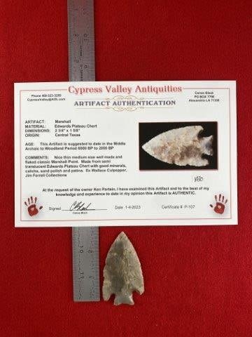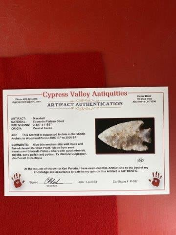 Please see picture for measurment. It is from Central Texas. Comes with Carlos Black Certificate of Authenticity. Ex- Wallace Culpepper ; Jim Ferrell ; Ken Partain ; KEY WORDS: NATIVE AMERICAN INDIAN ARTIFACT ARTIFACTS ARROWHEAD ARROWHEADS MISSISSIPPIAN QUAPAW CADDO POTTERY COINS