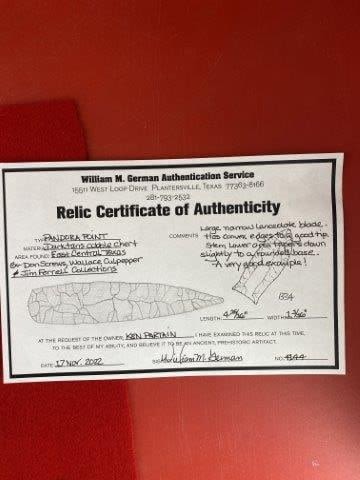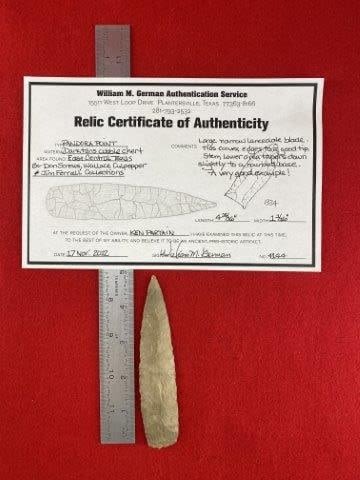 Please see picture for measurment. It is from East Central Texas. Comes with William German Certificate of Authenticity. Ex-Don Screws ; Wallace Culpepper ; Jim Ferrell ; Ken Partain ; KEY WORDS: NATIVE AMERICAN INDIAN ARTIFACT ARTIFACTS ARROWHEAD ARROWHEADS MISSISSIPPIAN QUAPAW CADDO POTTERY COINS