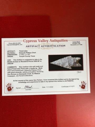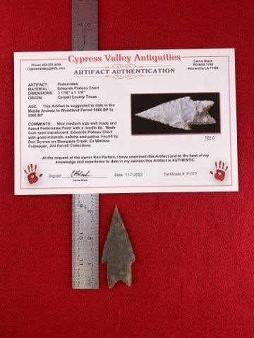 Please see picture for measurment. Found by Don Screws on Stampede Creek in Coryell County, Texas. Comes with Carlos Black Certificate of Authenticity. Ex-Don Screws ; Wallace Culpepper ; Jim Ferrell ; Ken Partain ; KEY WORDS: NATIVE AMERICAN INDIAN ARTIFACT ARTIFACTS ARROWHEAD ARROWHEADS MISSISSIPPIAN QUAPAW CADDO POTTERY COINS