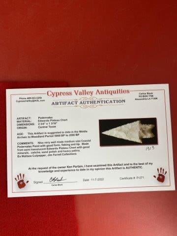 Please see picture for measurment. It is from Central Texas. Comes with Carlos Black Certificate of Authenticity. Ex- Wallace Culpepper ; Jim Ferrell ; Ken Partain ; KEY WORDS: NATIVE AMERICAN INDIAN ARTIFACT ARTIFACTS ARROWHEAD ARROWHEADS MISSISSIPPIAN QUAPAW CADDO POTTERY COINS