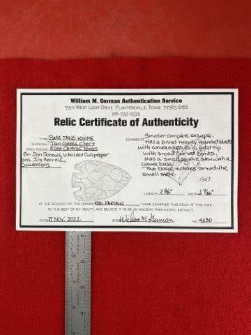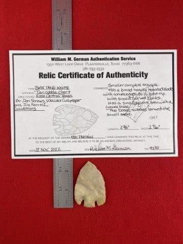 Please see picture for measurment. It is from East Central Texas County, Texas. Comes with William German Certificate of Authenticity. Ex-Don Screws ; Wallace Culpepper ; Jim Ferrell ; Ken Partain ; KEY WORDS: NATIVE AMERICAN INDIAN ARTIFACT ARTIFACTS ARROWHEAD ARROWHEADS MISSISSIPPIAN QUAPAW CADDO POTTERY COINS