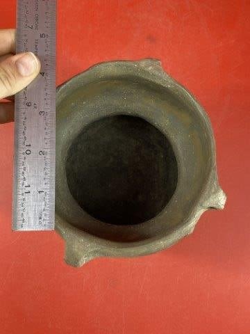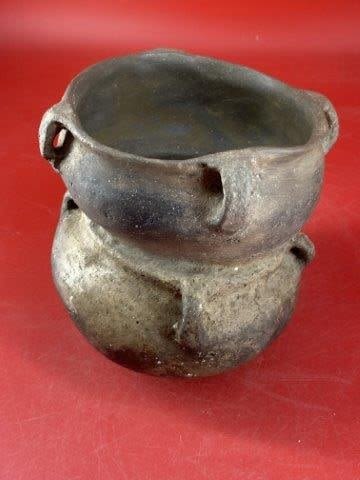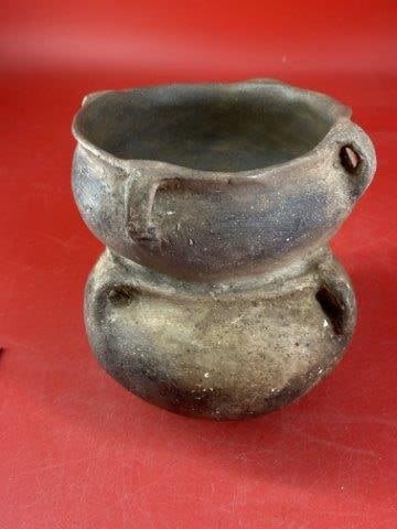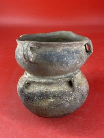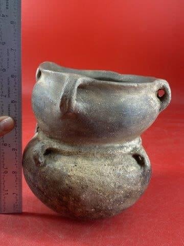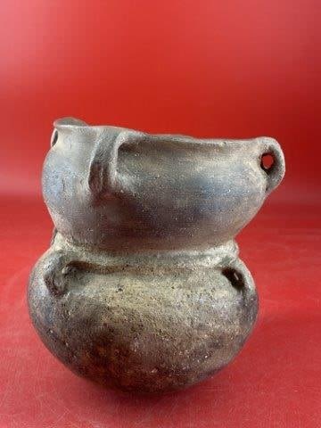 This Mississippian Compound Bowl Over Bowl is from the Brian Ashcraft Collection with each bowl having four strap handles. This bowl has some very well done restoration and displays well and is a very rare example. It is 6 & 1/2 inches tall by 6 & 1/2 inches wide. All items have been examined by Sam Johnson and are authentic in his opinion & he will paper any item for an additional $25 each. You must email me with the number you would like to have papered & call me to pay for the papers separately. 501-590-6771. Key words: Native American Indian Artifact Artifacts Arrowhead Arrowheads Mississippian Quapaw Caddo Pottery