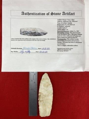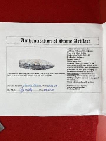 Please see picture for measurement. It is from Saline County Missouri. ex-Terry Allen Collection. Comes with a Motley Certificate of Authenticity. These artifacts are from multiple collections from around the United States. KEY WORDS: NATIVE AMERICAN INDIAN ARTIFACT ARTIFACTS ARROWHEAD ARROWHEADS MISSISSIPPIAN QUAPAW CADDO POTTERY COINS MORGAN DOLLAR PEACE DOLLAR SILVER COINS