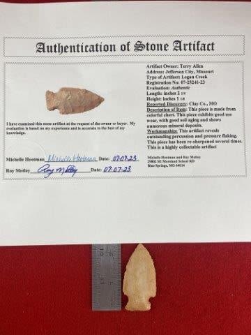 Please view the Motley Certificate of Authenticity for all information, where it is from , length, reported discovery, & the collections from which they came. Please see picture for measurement. These artifacts are from multiple collections from around the United States. KEY WORDS: NATIVE AMERICAN INDIAN ARTIFACT ARTIFACTS ARROWHEAD ARROWHEADS MISSISSIPPIAN QUAPAW CADDO POTTERY COINS MORGAN DOLLAR PEACE DOLLAR SILVER COINS