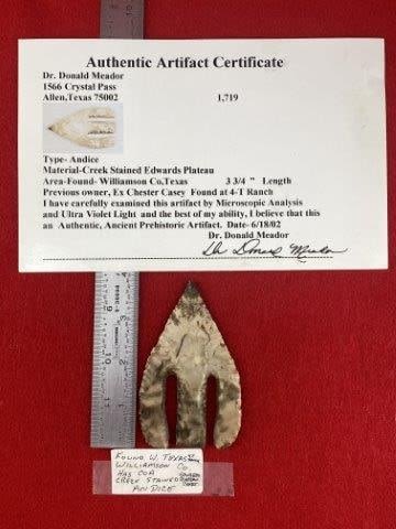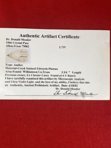Please view the Donald Meador Certificate of Authenticity for all information, where it is from , length, reported discovery, & the collections from which they came.Please see picture for measurement. These artifacts are from multiple collections from around the United States. KEY WORDS: NATIVE AMERICAN INDIAN ARTIFACT ARTIFACTS ARROWHEAD ARROWHEADS MISSISSIPPIAN QUAPAW CADDO POTTERY COINS MORGAN DOLLAR PEACE DOLLAR SILVER COINS