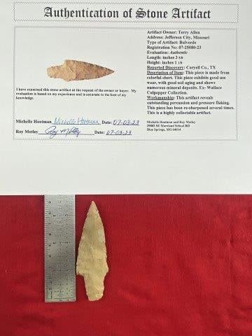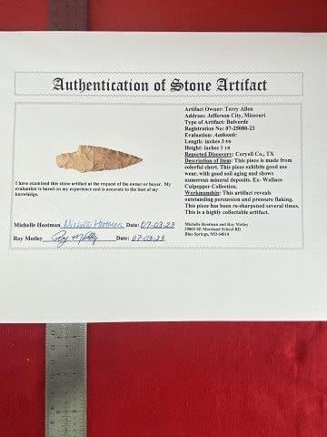 Please see picture for measurement. It is from Coryell County Texas. Ex- Wallace Culpepper Collection. These artifacts are from multiple collections from around the United States. Comes with a Roy Motley Certificate of Authenticity. KEY WORDS: NATIVE AMERICAN INDIAN ARTIFACT ARTIFACTS ARROWHEAD ARROWHEADS MISSISSIPPIAN QUAPAW CADDO POTTERY COINS MORGAN DOLLAR PEACE DOLLAR SILVER COINS