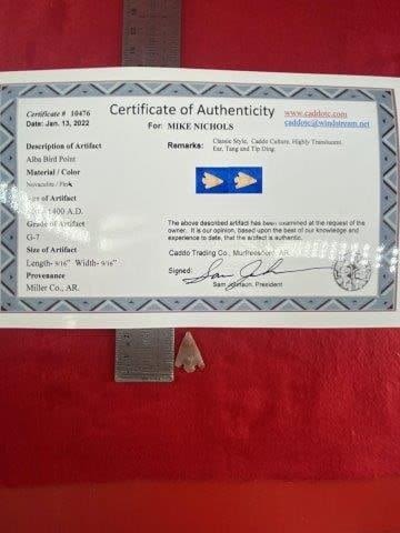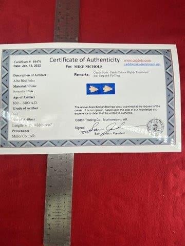 Please see picture for measurement. It is from Miller County Arkansas. It comes with Sam Johnson Certificate of Authenticity. These artifacts are from multiple collections from around the United States. KEY WORDS: NATIVE AMERICAN INDIAN ARTIFACT ARTIFACTS ARROWHEAD ARROWHEADS MISSISSIPPIAN QUAPAW CADDO POTTERY COINS MORGAN DOLLAR PEACE DOLLAR SILVER COINS
