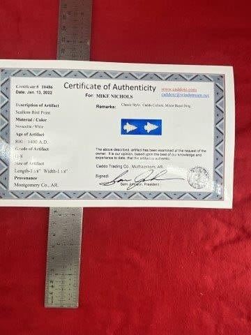 Please see picture for measurement. It is from Montgomery County Arkansas. It comes with Sam Johnson Certificate of Authenticity. These artifacts are from multiple collections from around the United States. KEY WORDS: NATIVE AMERICAN INDIAN ARTIFACT ARTIFACTS ARROWHEAD ARROWHEADS MISSISSIPPIAN QUAPAW CADDO POTTERY COINS MORGAN DOLLAR PEACE DOLLAR SILVER COINS