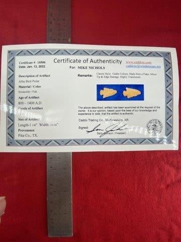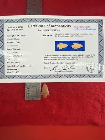 Please see picture for measurement. It is from Pike County Texas. It comes with a Sam Johnson Certificate of Authenticity. These artifacts are from multiple collections from around the United States. KEY WORDS: NATIVE AMERICAN INDIAN ARTIFACT ARTIFACTS ARROWHEAD ARROWHEADS MISSISSIPPIAN QUAPAW CADDO POTTERY COINS MORGAN DOLLAR PEACE DOLLAR SILVER COINS