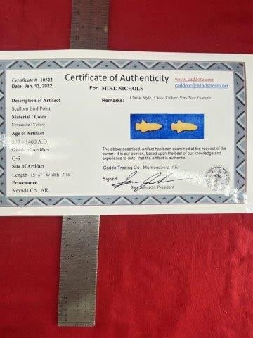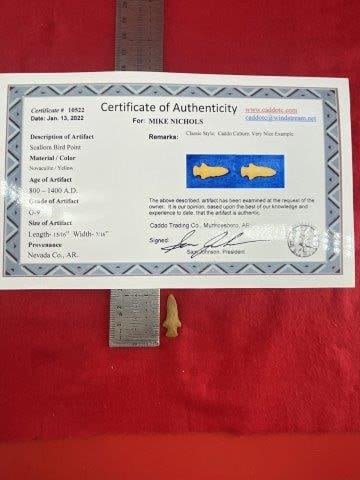 Please see picture for measurement. It is from Nevada County Arkansas. It comes with a Sam Johnson Certificate of Authenticity. These artifacts are from multiple collections from around the United States. KEY WORDS: NATIVE AMERICAN INDIAN ARTIFACT ARTIFACTS ARROWHEAD ARROWHEADS MISSISSIPPIAN QUAPAW CADDO POTTERY COINS MORGAN DOLLAR PEACE DOLLAR SILVER COINS