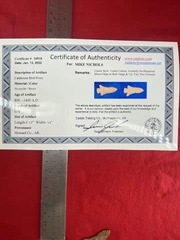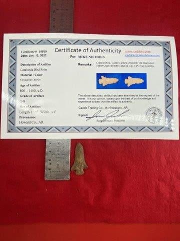 Please see picture for measurement. It is from Howard County Arkansas. It comes with a Sam Johnson Certificate of Authenticity. These artifacts are from multiple collections from around the United States. KEY WORDS: NATIVE AMERICAN INDIAN ARTIFACT ARTIFACTS ARROWHEAD ARROWHEADS MISSISSIPPIAN QUAPAW CADDO POTTERY COINS MORGAN DOLLAR PEACE DOLLAR SILVER COINS