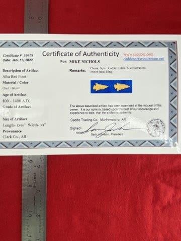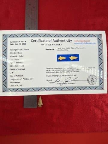 Please see picture for measurement. It is from Clark County Arkansas. It comes with a Sam Johnson Certificate of Authenticity. These artifacts are from multiple collections from around the United States. KEY WORDS: NATIVE AMERICAN INDIAN ARTIFACT ARTIFACTS ARROWHEAD ARROWHEADS MISSISSIPPIAN QUAPAW CADDO POTTERY COINS MORGAN DOLLAR PEACE DOLLAR SILVER COINS