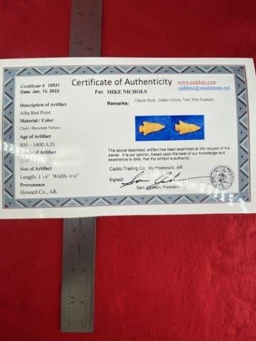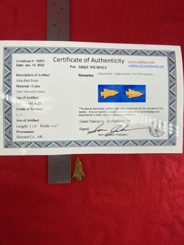 Please see picture for measurement. It is from Howard County Arkansas. It comes with a Sam Johnson Certificate of Authenticity. These artifacts are from multiple collections from around the United States. KEY WORDS: NATIVE AMERICAN INDIAN ARTIFACT ARTIFACTS ARROWHEAD ARROWHEADS MISSISSIPPIAN QUAPAW CADDO POTTERY COINS MORGAN DOLLAR PEACE DOLLAR SILVER COINS