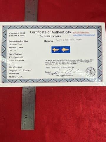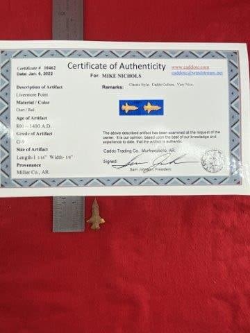 Please see picture for measurement. It is from Miller County Arkansas. It comes with a Sam Johnson Certificate of Authenticity. These artifacts are from multiple collections from around the United States. KEY WORDS: NATIVE AMERICAN INDIAN ARTIFACT ARTIFACTS ARROWHEAD ARROWHEADS MISSISSIPPIAN QUAPAW CADDO POTTERY COINS MORGAN DOLLAR PEACE DOLLAR SILVER COINS