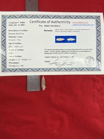 Please see picture for measurement. It is from Nevada County Arkansas. It comes with a Sam Johnson Certificate of Authenticity. These artifacts are from multiple collections from around the United States. KEY WORDS: NATIVE AMERICAN INDIAN ARTIFACT ARTIFACTS ARROWHEAD ARROWHEADS MISSISSIPPIAN QUAPAW CADDO POTTERY COINS MORGAN DOLLAR PEACE DOLLAR SILVER COINS