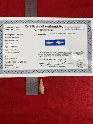 Please see picture for measurement. It is from Nevada County Arkansas. It comes with a Sam Johnson Certificate of Authenticity. These artifacts are from multiple collections from around the United States. KEY WORDS: NATIVE AMERICAN INDIAN ARTIFACT ARTIFACTS ARROWHEAD ARROWHEADS MISSISSIPPIAN QUAPAW CADDO POTTERY COINS MORGAN DOLLAR PEACE DOLLAR SILVER COINS
