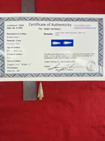 Please see picture for measurement. It is from Pike County Arkansas. It comes with a Sam Johnson Certificate of Authenticity. These artifacts are from multiple collections from around the United States. KEY WORDS: NATIVE AMERICAN INDIAN ARTIFACT ARTIFACTS ARROWHEAD ARROWHEADS MISSISSIPPIAN QUAPAW CADDO POTTERY COINS MORGAN DOLLAR PEACE DOLLAR SILVER COINS
