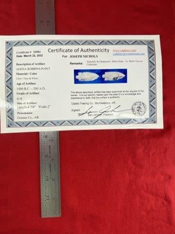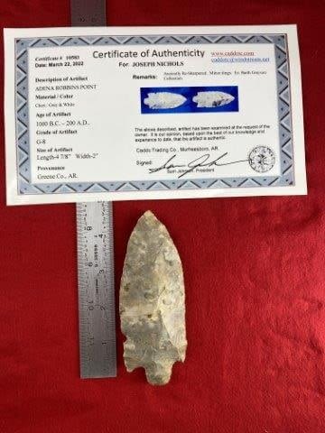 Please see picture for measurement. It is from Greene County Arkansas. It comes with a Sam Johnson Certificate of Authenticity. These artifacts are from multiple collections from around the United States. KEY WORDS: NATIVE AMERICAN INDIAN ARTIFACT ARTIFACTS ARROWHEAD ARROWHEADS MISSISSIPPIAN QUAPAW CADDO POTTERY COINS MORGAN DOLLAR PEACE DOLLAR SILVER COINS