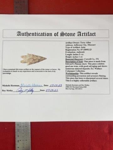 Please see picture for measurement. It is from Coryell County Texas. Ex- Wallace Culpepper Collection. These artifacts are from multiple collections from around the United States. Comes with a Roy Motley Certificate of Authenticity. KEY WORDS: NATIVE AMERICAN INDIAN ARTIFACT ARTIFACTS ARROWHEAD ARROWHEADS MISSISSIPPIAN QUAPAW CADDO POTTERY COINS MORGAN DOLLAR PEACE DOLLAR SILVER COINS