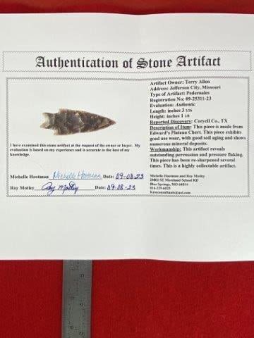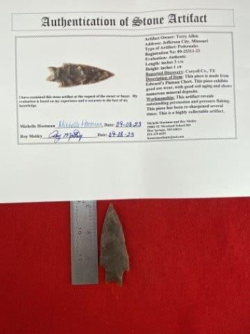 Please see picture for measurement. It is from Coryell County Texas. It comes with a Roy Motley Certificate of Authenticity. These artifacts are from multiple collections from around the United States. KEY WORDS: NATIVE AMERICAN INDIAN ARTIFACT ARTIFACTS ARROWHEAD ARROWHEADS MISSISSIPPIAN QUAPAW CADDO POTTERY COINS MORGAN DOLLAR PEACE DOLLAR SILVER COINS