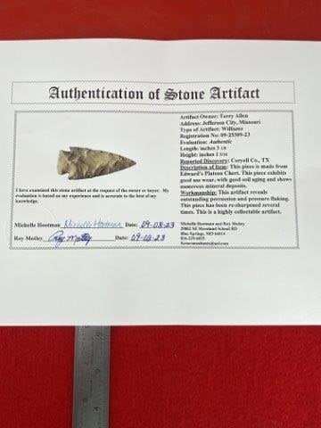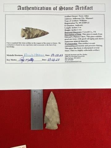 Please see picture for measurement. It is from Coryell County Texas. It comes with a Roy Motley Certificate of Authenticity. These artifacts are from multiple collections from around the United States. KEY WORDS: NATIVE AMERICAN INDIAN ARTIFACT ARTIFACTS ARROWHEAD ARROWHEADS MISSISSIPPIAN QUAPAW CADDO POTTERY COINS MORGAN DOLLAR PEACE DOLLAR SILVER COINS