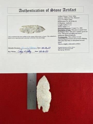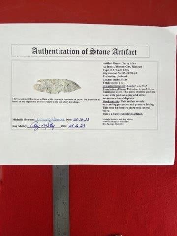 Please see picture for measurement. It is from Cooper County Missouri. It comes with a Roy Motley Certificate of Authenticity. These artifacts are from multiple collections from around the United States. KEY WORDS: NATIVE AMERICAN INDIAN ARTIFACT ARTIFACTS ARROWHEAD ARROWHEADS MISSISSIPPIAN QUAPAW CADDO POTTERY COINS MORGAN DOLLAR PEACE DOLLAR SILVER COINS