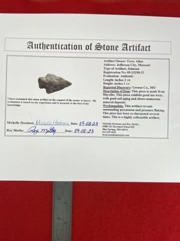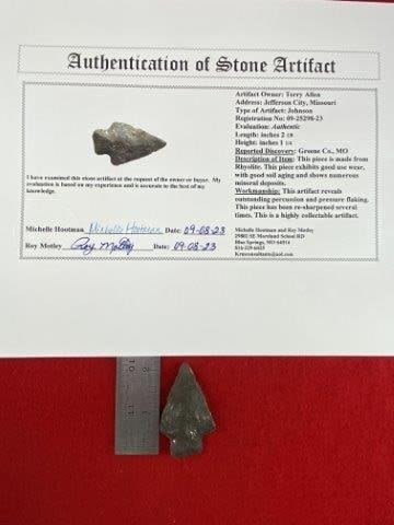 Please see picture for measurement. It is from Greene County Missouri. It comes with a Roy Motley Certificate of Authenticity. These artifacts are from multiple collections from around the United States. KEY WORDS: NATIVE AMERICAN INDIAN ARTIFACT ARTIFACTS ARROWHEAD ARROWHEADS MISSISSIPPIAN QUAPAW CADDO POTTERY COINS MORGAN DOLLAR PEACE DOLLAR SILVER COINS