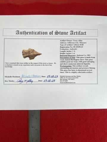 Please see picture for measurement. It is from Jackson County Missouri. It comes with a Roy Motley Certificate of Authenticity. These artifacts are from multiple collections from around the United States. KEY WORDS: NATIVE AMERICAN INDIAN ARTIFACT ARTIFACTS ARROWHEAD ARROWHEADS MISSISSIPPIAN QUAPAW CADDO POTTERY COINS MORGAN DOLLAR PEACE DOLLAR SILVER COINS