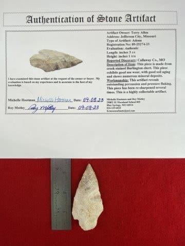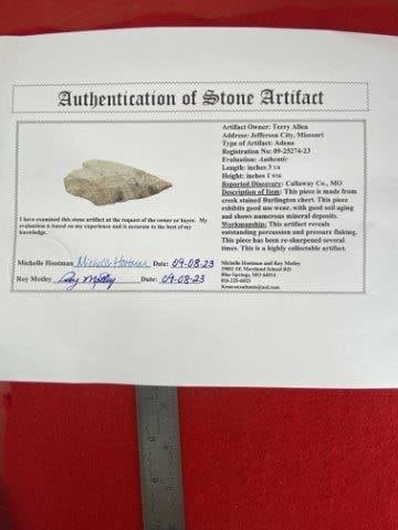Please see picture for measurement. It is from Callaway County Missouri. It comes with a Roy Motley Certificate of Authenticity. These artifacts are from multiple collections from around the United States. KEY WORDS: NATIVE AMERICAN INDIAN ARTIFACT ARTIFACTS ARROWHEAD ARROWHEADS MISSISSIPPIAN QUAPAW CADDO POTTERY COINS MORGAN DOLLAR PEACE DOLLAR SILVER COINS