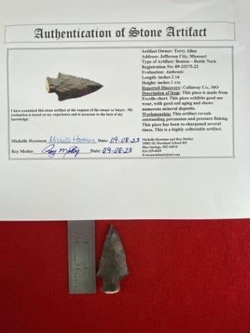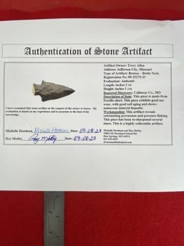 Please see picture for measurement. It is from Callaway County Missouri. It comes with a Roy Motley Certificate of Authenticity. These artifacts are from multiple collections from around the United States. KEY WORDS: NATIVE AMERICAN INDIAN ARTIFACT ARTIFACTS ARROWHEAD ARROWHEADS MISSISSIPPIAN QUAPAW CADDO POTTERY COINS MORGAN DOLLAR PEACE DOLLAR SILVER COINS