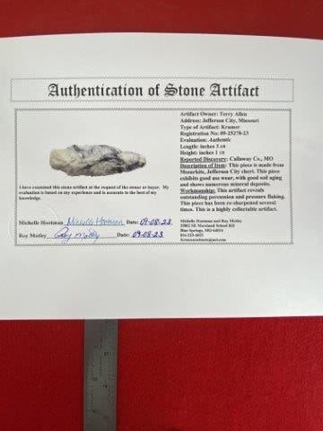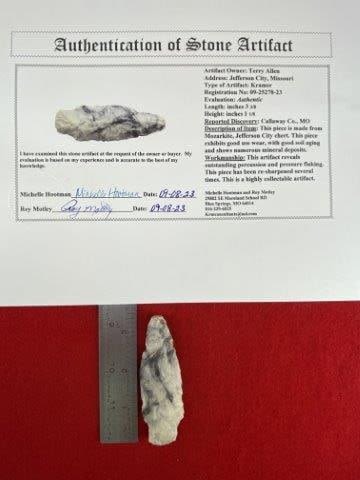 Please see picture for measurement. It is from Callaway County Missouri. It comes with a Roy Motley Certificate of Authenticity. These artifacts are from multiple collections from around the United States. KEY WORDS: NATIVE AMERICAN INDIAN ARTIFACT ARTIFACTS ARROWHEAD ARROWHEADS MISSISSIPPIAN QUAPAW CADDO POTTERY COINS MORGAN DOLLAR PEACE DOLLAR SILVER COINS
