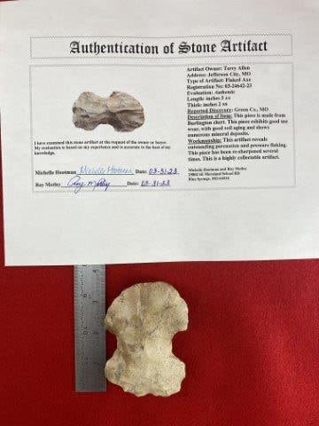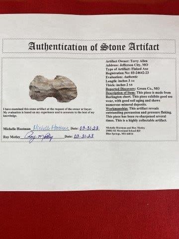 Please see picture for measurement. It comes with a Roy Motley Certificate of Authenticity. It is from Green County Missouri. These artifacts are from multiple collections from around the United States. KEY WORDS: NATIVE AMERICAN INDIAN ARTIFACT ARTIFACTS ARROWHEAD ARROWHEADS MISSISSIPPIAN QUAPAW CADDO POTTERY COINS MORGAN DOLLAR PEACE DOLLAR SILVER COINS
