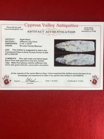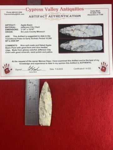 Please see picture for measurement. It comes with a Carlos Black Certificate of Authenticity. It is from St Louis County Missouri. These artifacts are from multiple collections from around the United States. KEY WORDS: NATIVE AMERICAN INDIAN ARTIFACT ARTIFACTS ARROWHEAD ARROWHEADS MISSISSIPPIAN QUAPAW CADDO POTTERY COINS MORGAN DOLLAR PEACE DOLLAR SILVER COINS