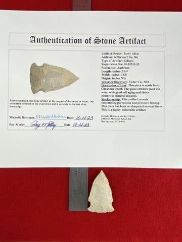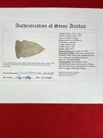 Please see picture for measurement. It is from Cedar County Missouri. It comes with a Motley Certificate of Authenticity.These artifacts are from multiple collections from around the United States. KEY WORDS: NATIVE AMERICAN INDIAN ARTIFACT ARTIFACTS ARROWHEAD ARROWHEADS MISSISSIPPIAN QUAPAW CADDO POTTERY COINS MORGAN DOLLAR PEACE DOLLAR SILVER COINS