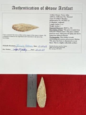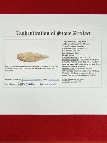 Please see picture for measurement. It is from Bell County Texas.It comes with a Motley Certificate of Authenticity. These artifacts are from multiple collections from around the United States. KEY WORDS: NATIVE AMERICAN INDIAN ARTIFACT ARTIFACTS ARROWHEAD ARROWHEADS MISSISSIPPIAN QUAPAW CADDO POTTERY COINS MORGAN DOLLAR PEACE DOLLAR SILVER COINS
