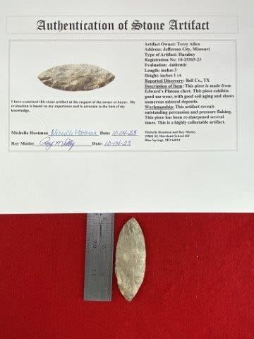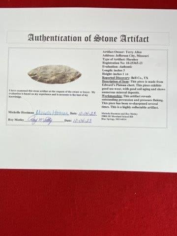 Please see picture for measurement. It is from Bell County Texas. It comes with a Motley Certificate of Authenticity.These artifacts are from multiple collections from around the United States. KEY WORDS: NATIVE AMERICAN INDIAN ARTIFACT ARTIFACTS ARROWHEAD ARROWHEADS MISSISSIPPIAN QUAPAW CADDO POTTERY COINS MORGAN DOLLAR PEACE DOLLAR SILVER COINS