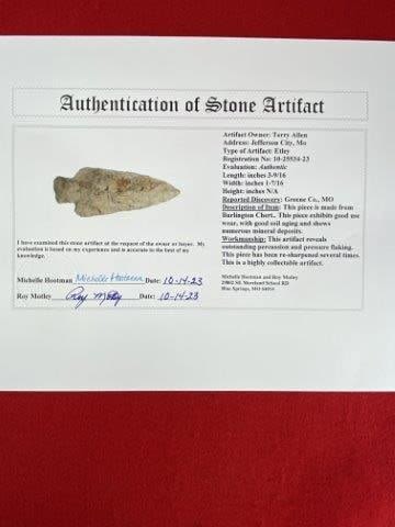 Please see picture for measurement. It is from Greene County Missouri.It comes with a Motley Certificate of Authenticity.These artifacts are from multiple collections from around the United States. KEY WORDS: NATIVE AMERICAN INDIAN ARTIFACT ARTIFACTS ARROWHEAD ARROWHEADS MISSISSIPPIAN QUAPAW CADDO POTTERY COINS MORGAN DOLLAR PEACE DOLLAR SILVER COINS